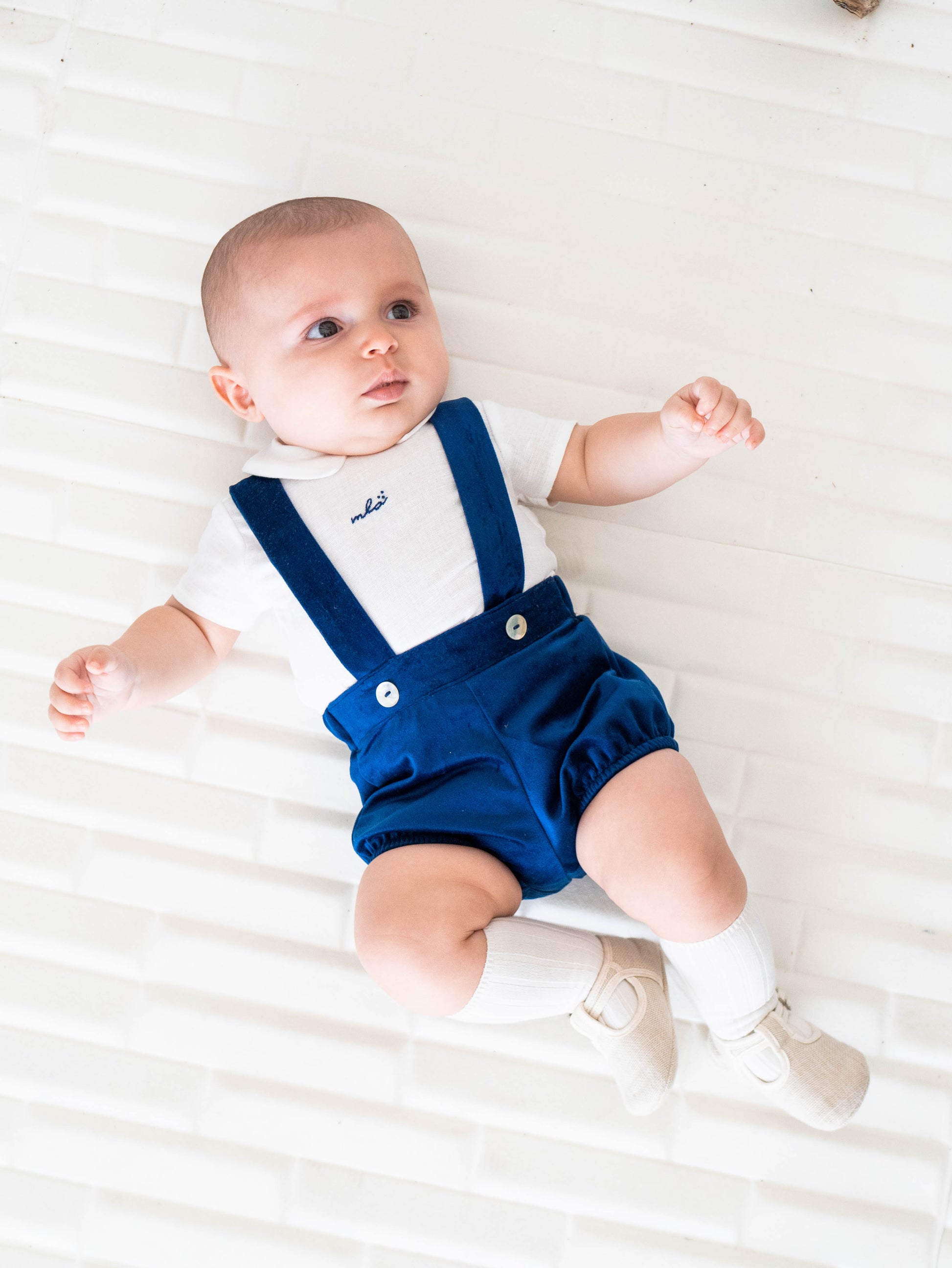 Conjunto bombacha c/tirantes varón velvet marino bordado a mano