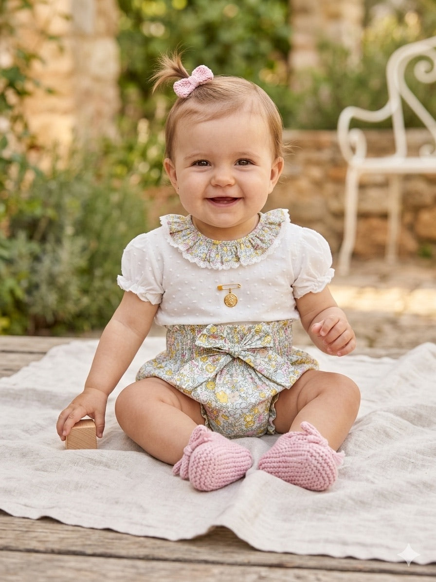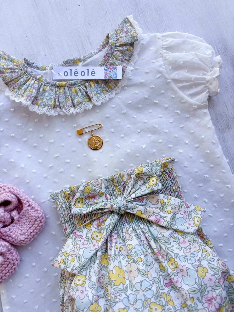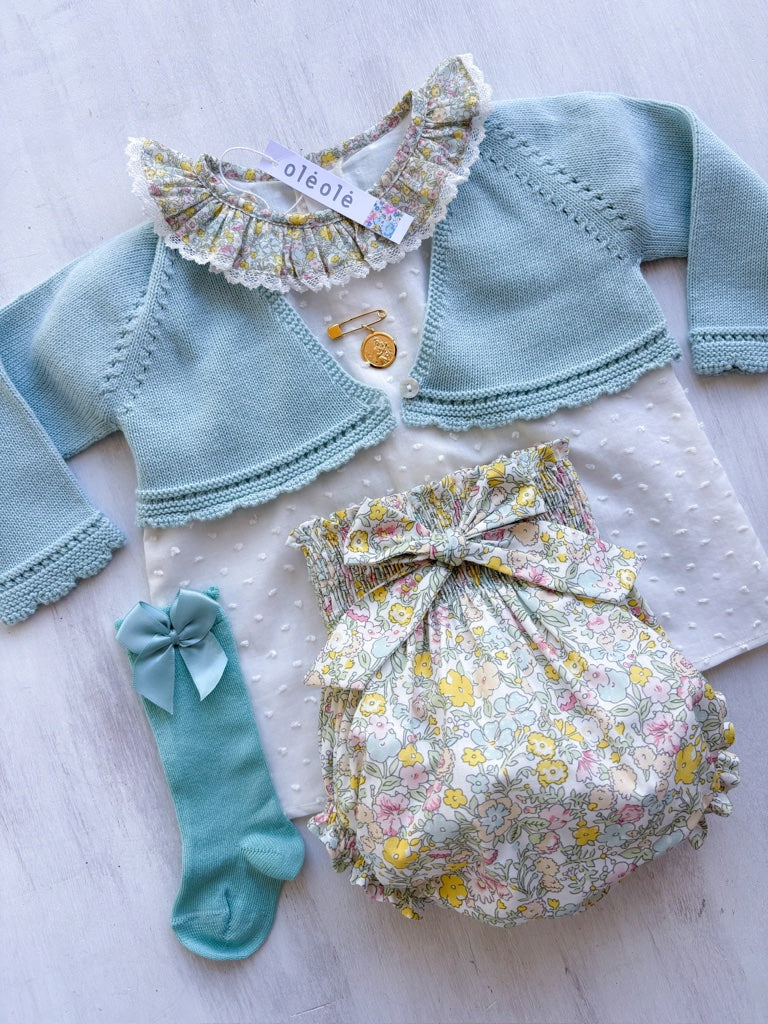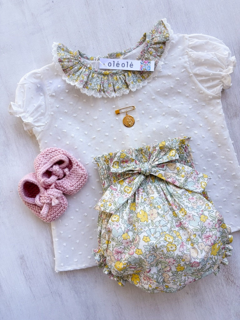 Conjunto MatchyCuello bombacha flores medianas amarillo y verde agua combinado